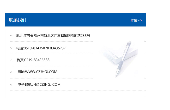 地址:常州市新北區友邦商務大廈1幢16、17層  電話:0519-85101652  傳真:0519-85112595  郵編:213022  網址:www_cz-jiayue_cn.fjwswl.com  郵箱:xiajifengaa@163.com